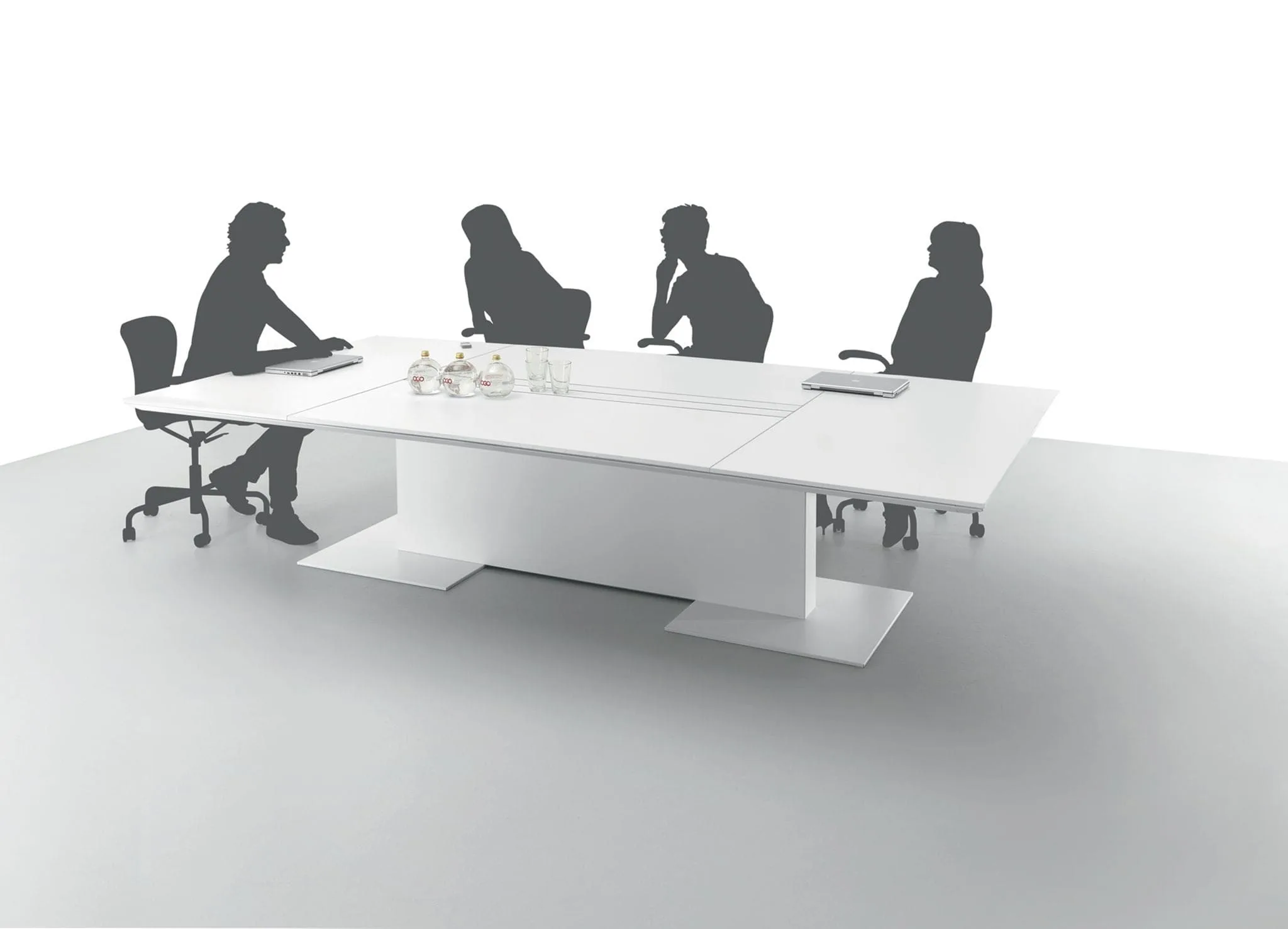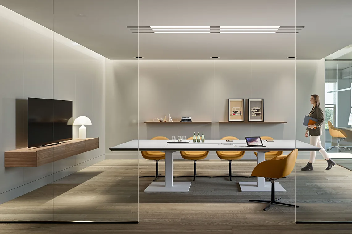 Anche nelle sale riunioni Anyware soddisfa requisiti di funzionalità, comfort ed estetica. Le soluzioni proposte possono avere le 4 gambe perimetrali Anyware o le piantane in acciaio disponibili anche laccate. Una soluzione originale e funzionale è proposta nel tavolo Anyware con barra centrale che permette l’aggancio di screen Turnable per suddividere lo spazio di