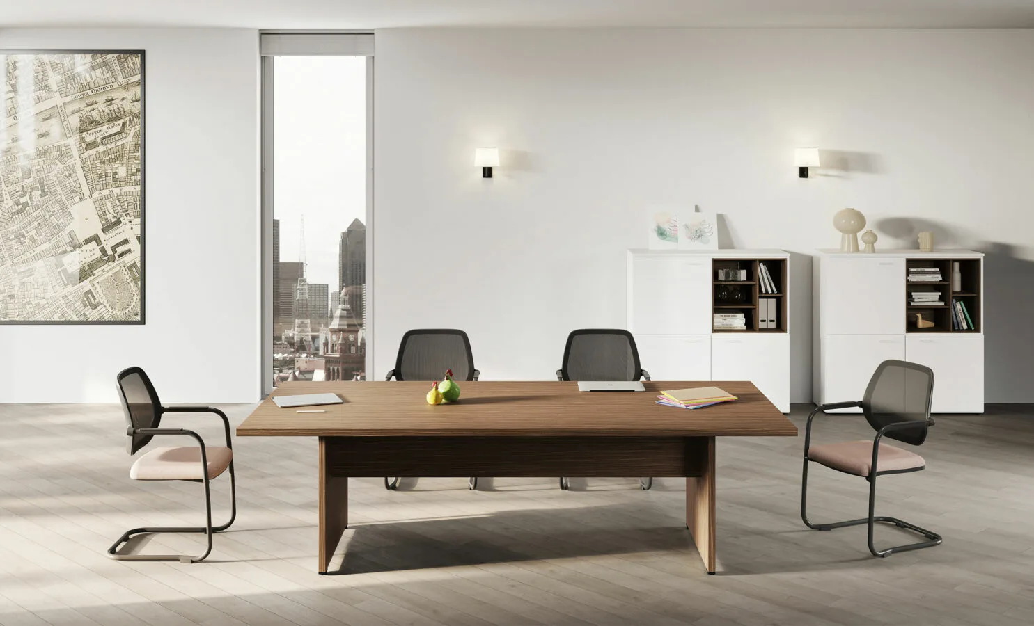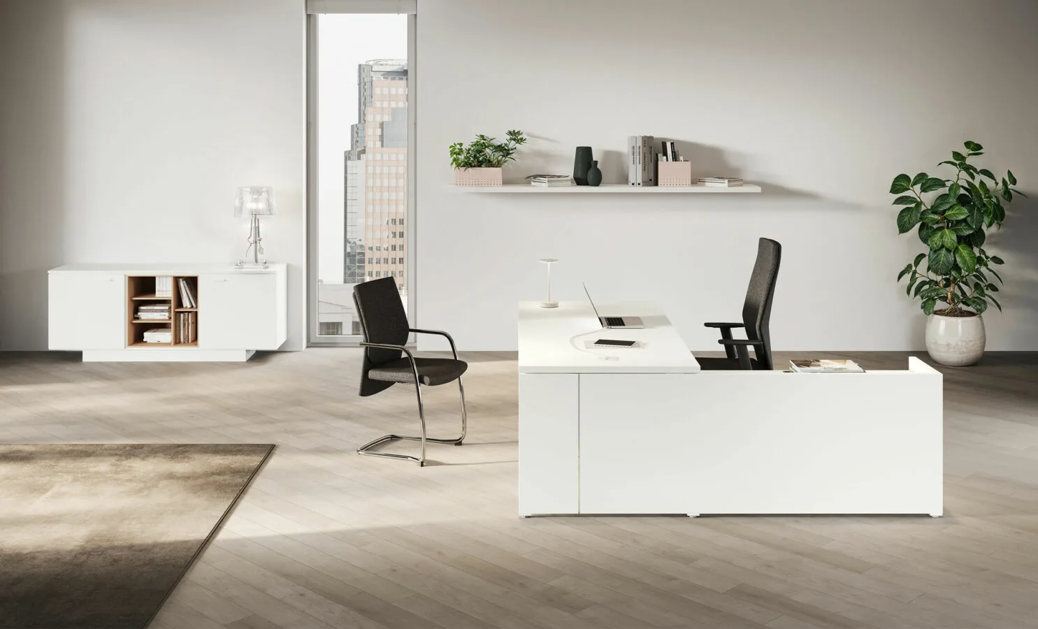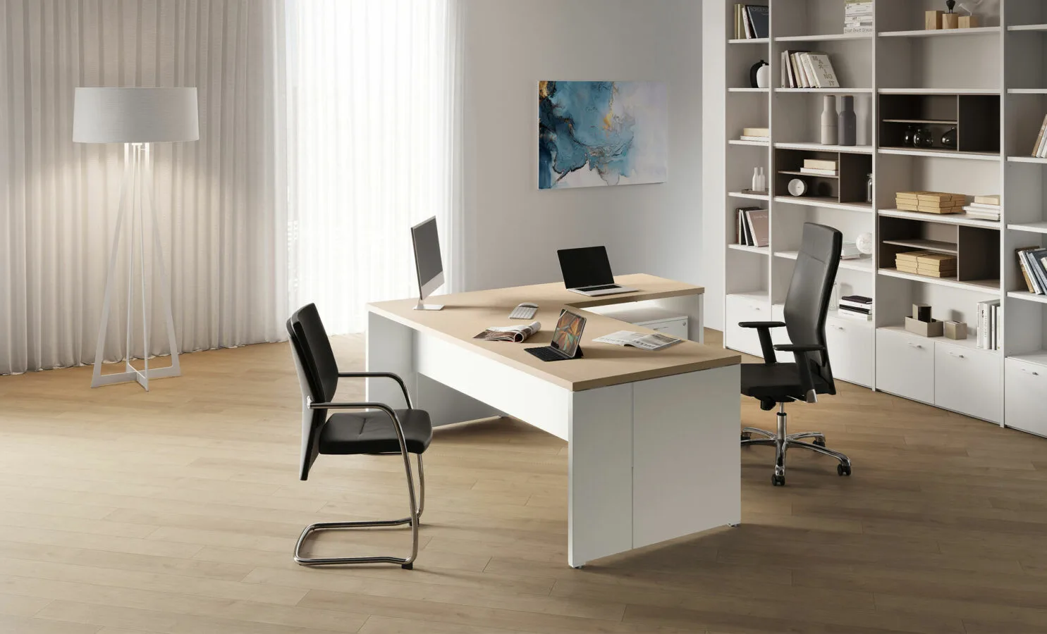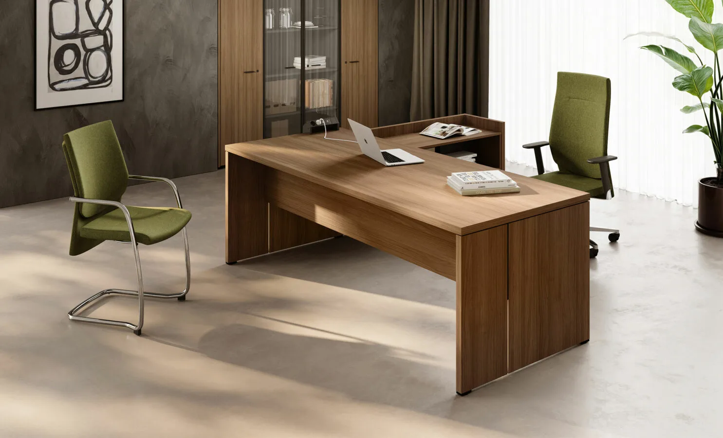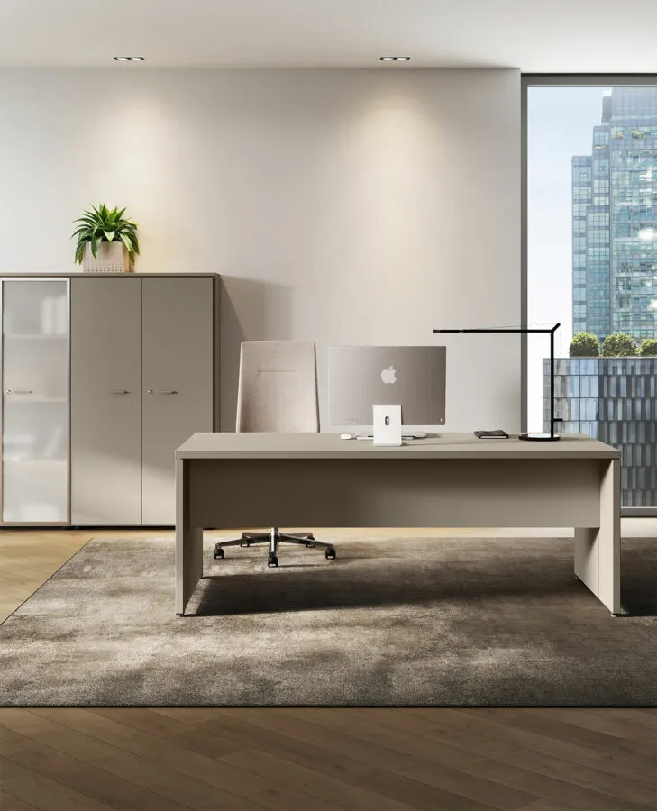 Una scrivania direzionale interamente in legno, con e senza allungo, dalle linee nette e decise.