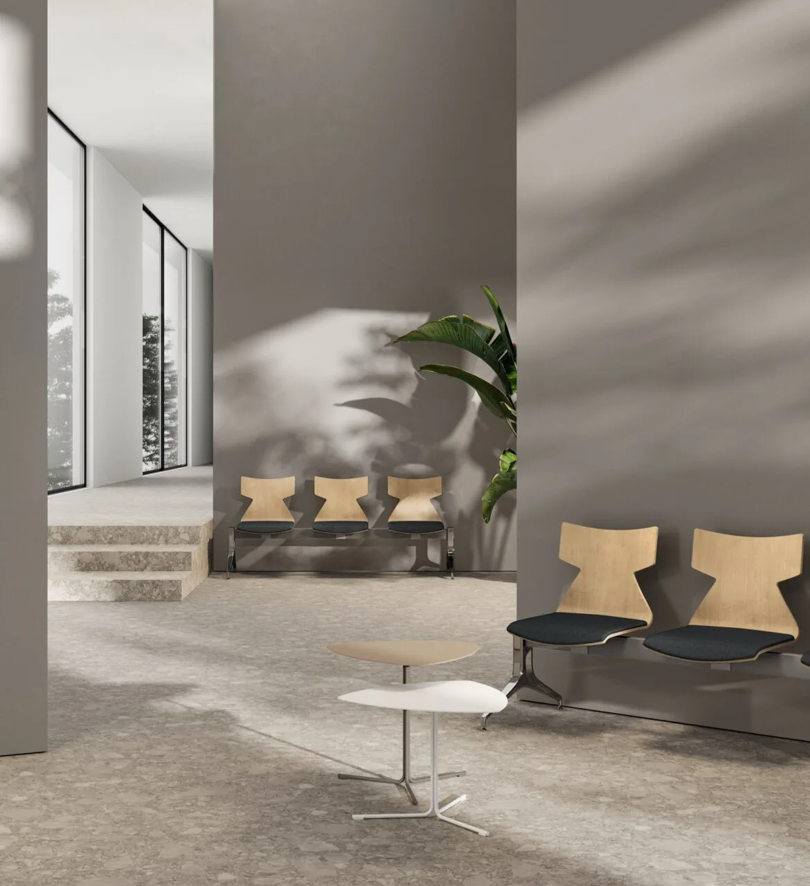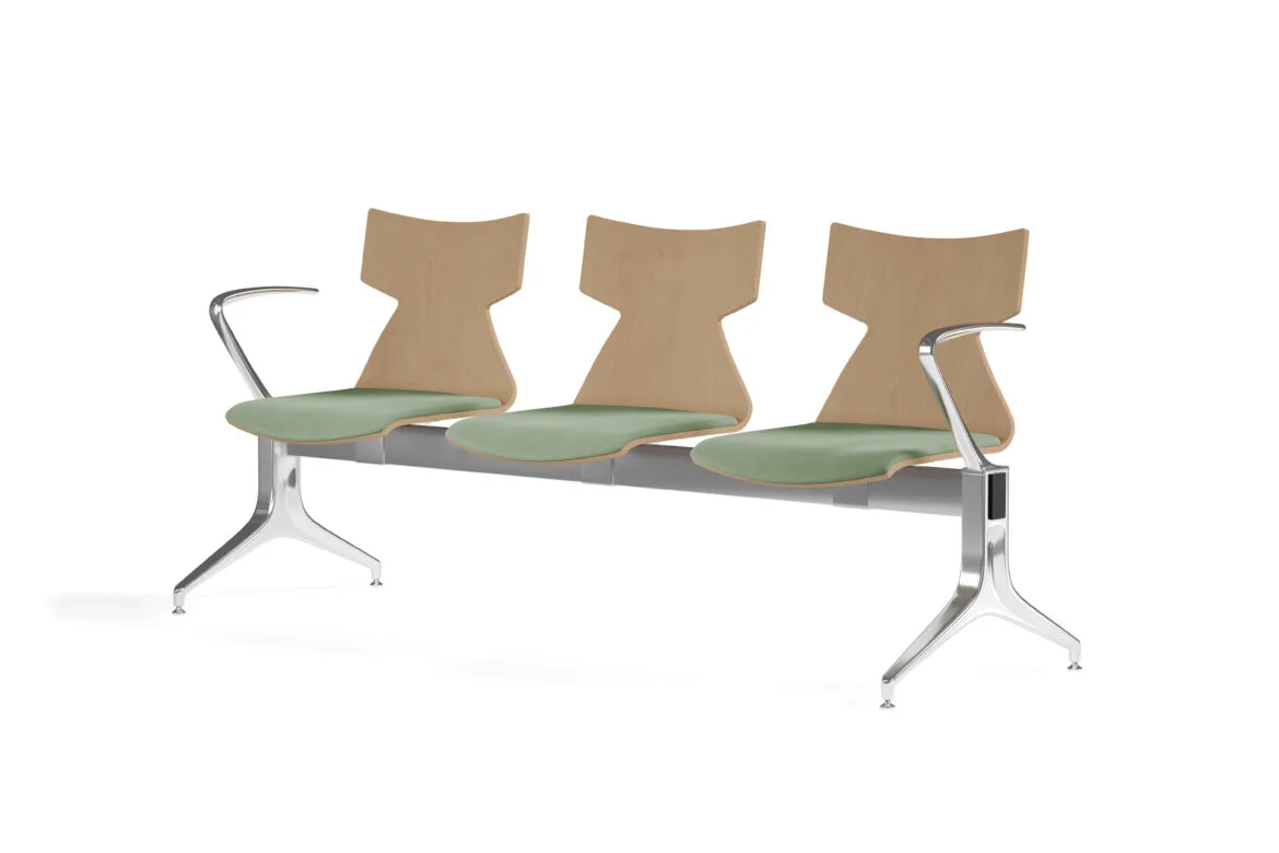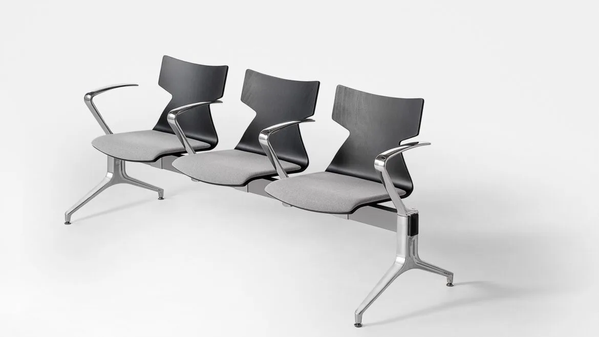 La sedia su trave Kimbox Wood è caratterizzata da una scocca in faggio naturale o verniciato nero. Le sedute Kimbox sono proposte anche nella