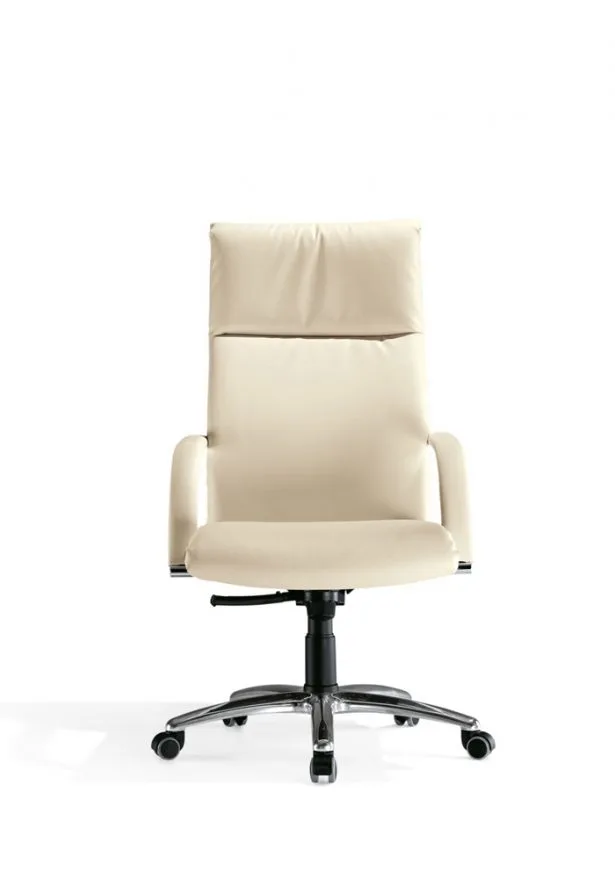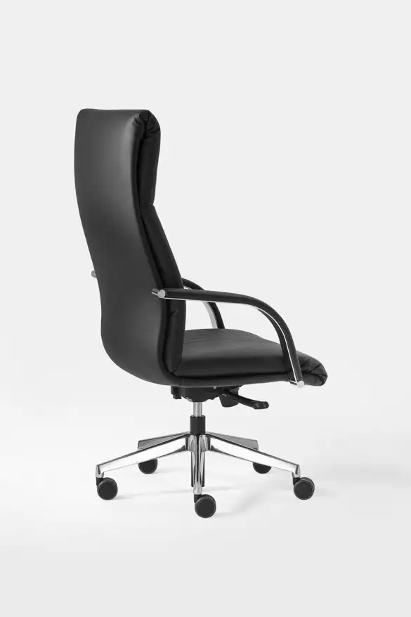 Poltrona direzione con monoscocca in multistrato curvato faggio-pioppo e imbottitura in poliuretano espanso indeformabile. Braccioli in acciaio cromato con soprabracciolo in multistrato e imbottitura in poliuretano