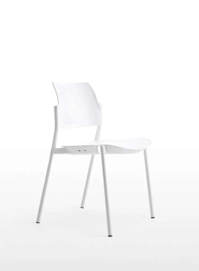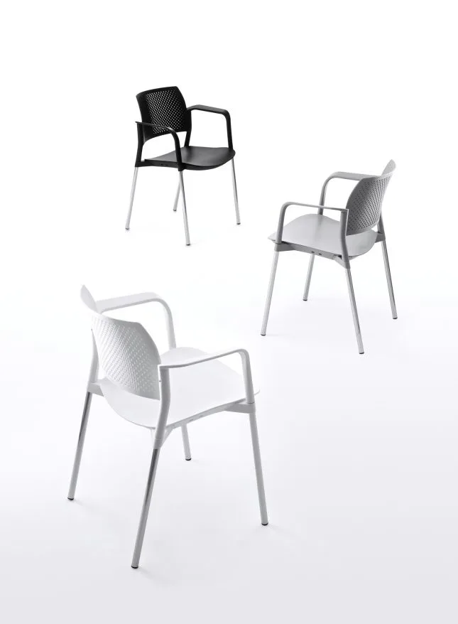 La sedia impilabile e agganciabile Kyos è disponibile con telaio 4-gambe o slitta, con o senza braccioli, nella versione in polipropilene bianco, nero e grigio, può essere sia con sedile imbottito che con sedile e schienale