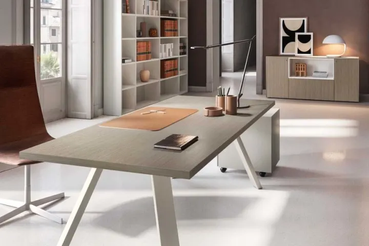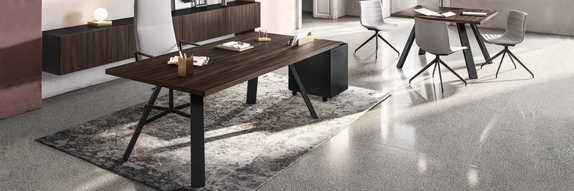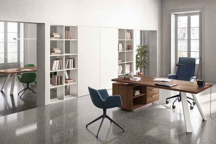Un progetto versatile e raffinato che prende origine da un’ispirazione minimal-chic e che ha dato vita a un design geometrico e confortevole. Lavorazioni eccellenti e utilizzo di melaminici esclusivi, lo rendono adatto all’ufficio sia per l’operatività singola, sia per la riunione e il contenimento.