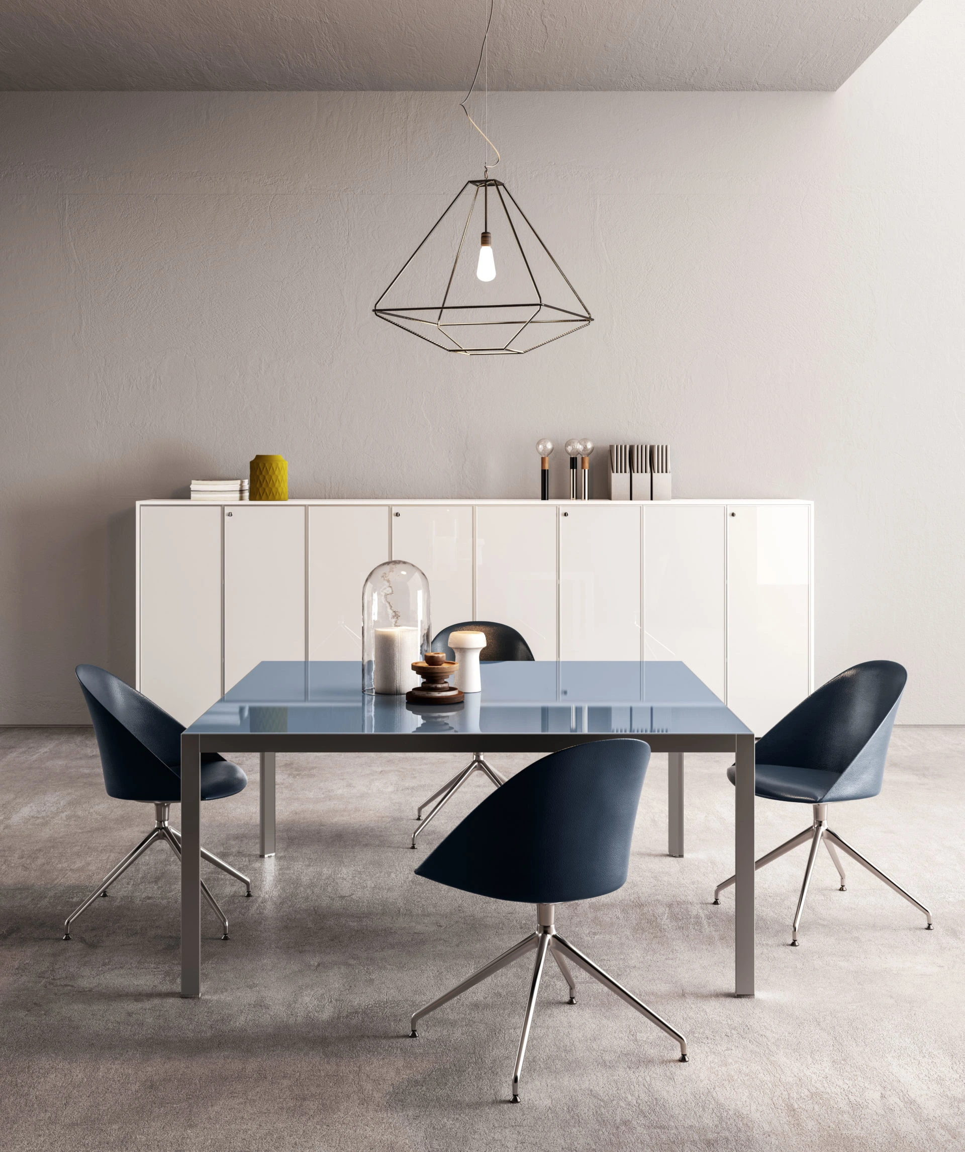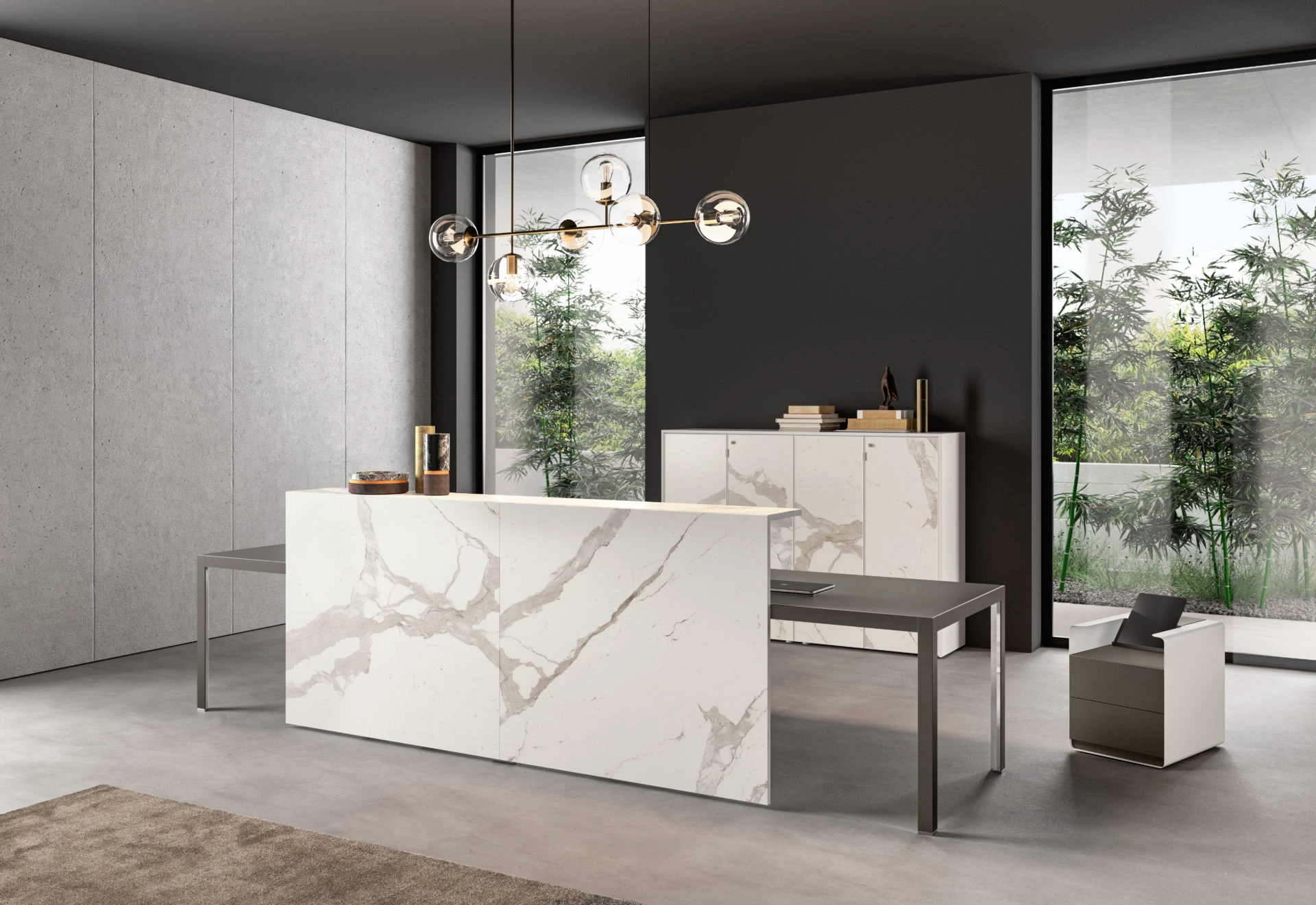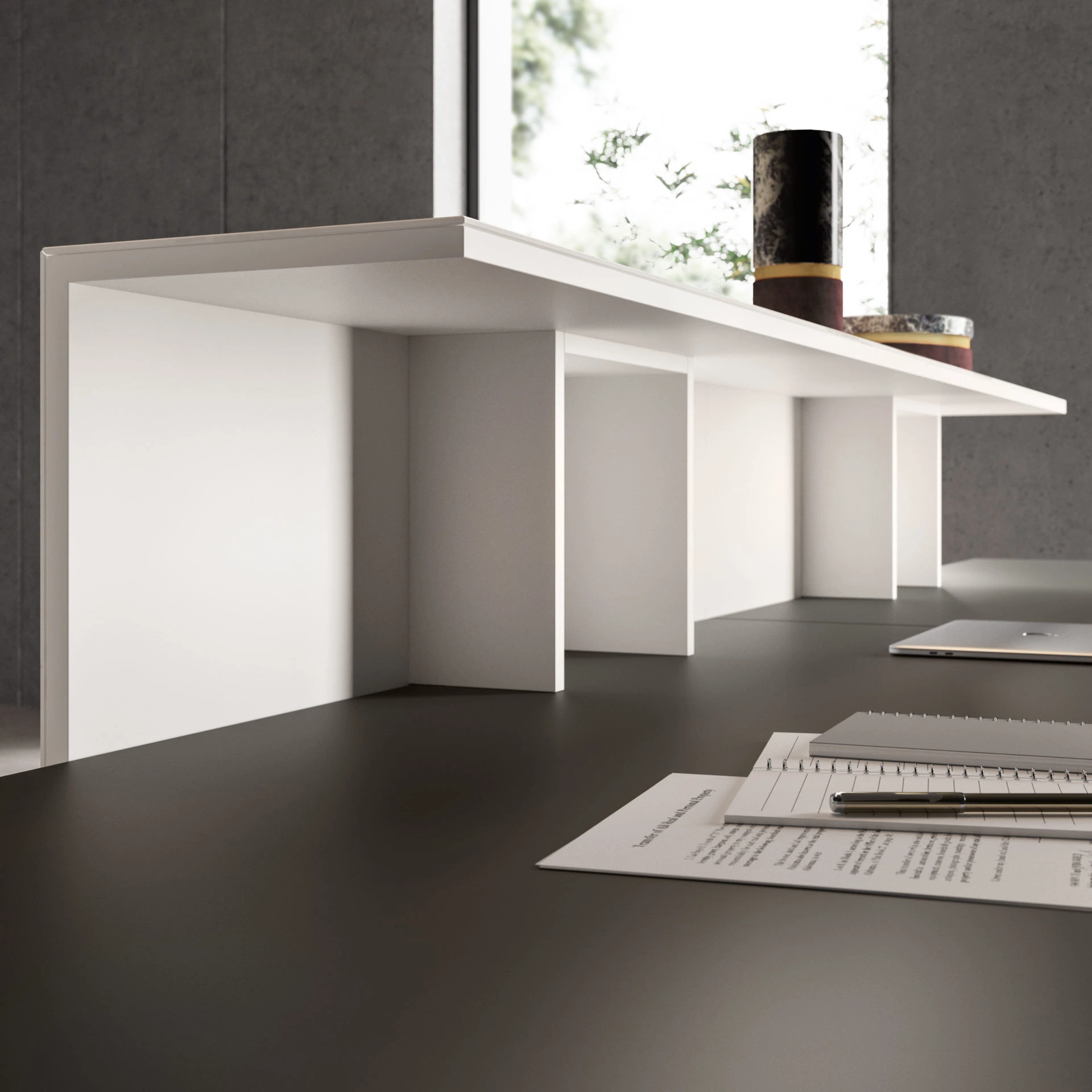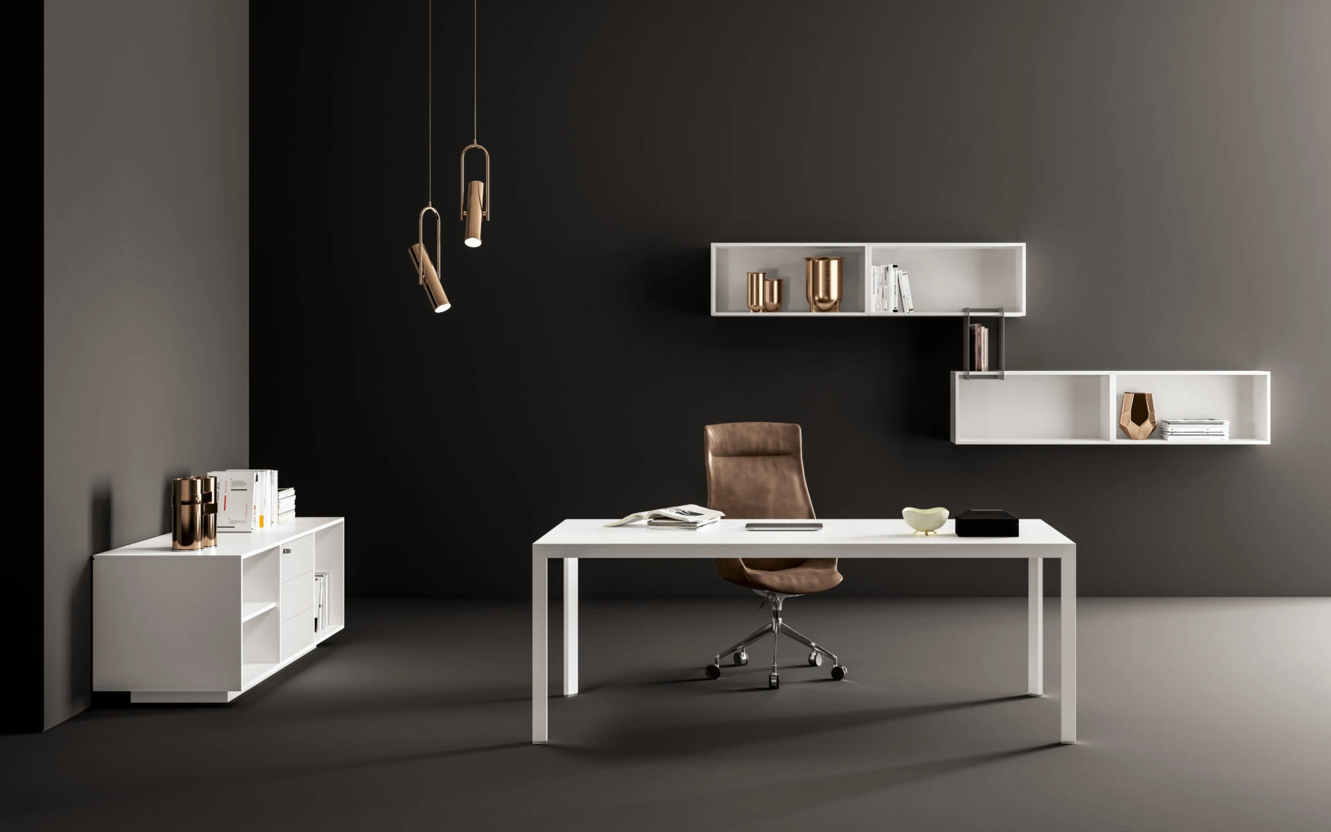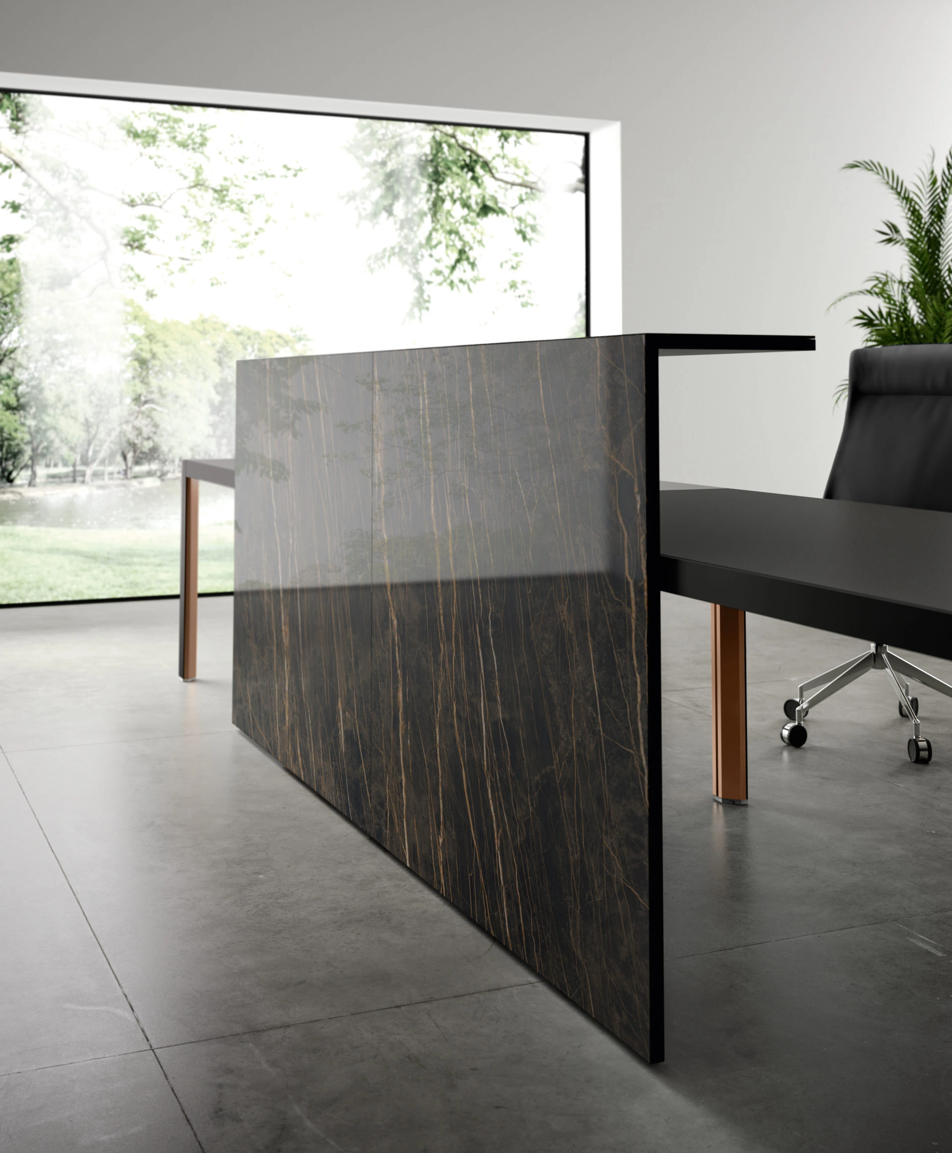 Un ufficio, infinite prospettive. HYPE ridefinisce l’ambiente direzionale con una linea completa e studiata nel dettaglio: dalle postazioni direzionali alle sale riunione, dalle aree per la reception ai mobili di contenimento. La struttura in alluminio della scrivania, frutto di un design minimal ed essenziale, viene esaltata dalle pregiate varianti per il piano di lavoro: melaminico, laccato, impiallacciato, vetro, pelle o Laminam®. Due le