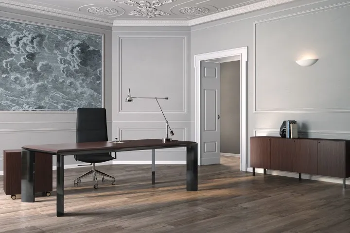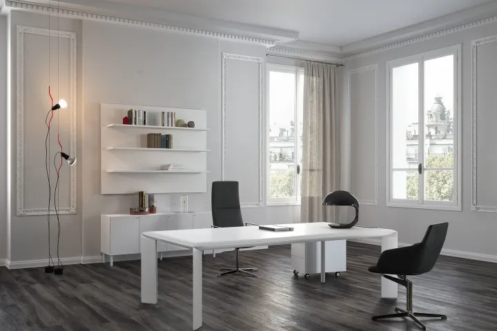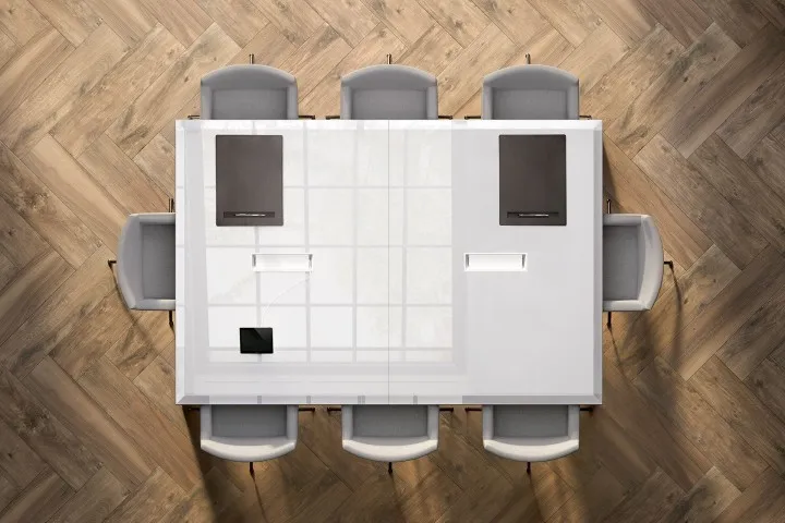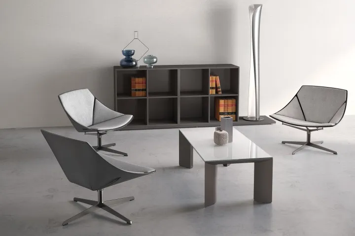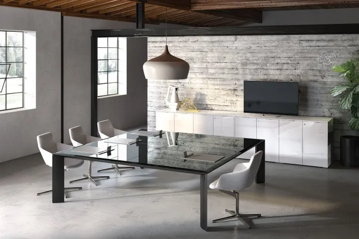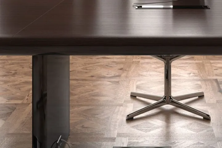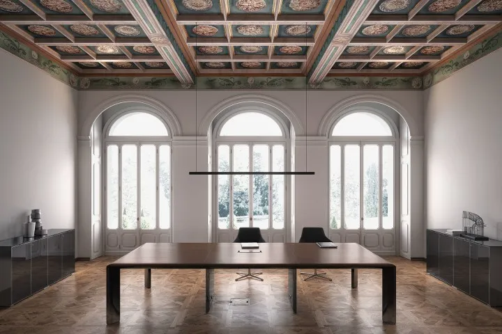 Kono è la collezione che concilia estetica, prestigio ed essenzialità. Un sistema modulare che permette di allungare all’infinito il tavolo riunioni, e prevede il contenimento e il passaggio dell’elettrificazione.