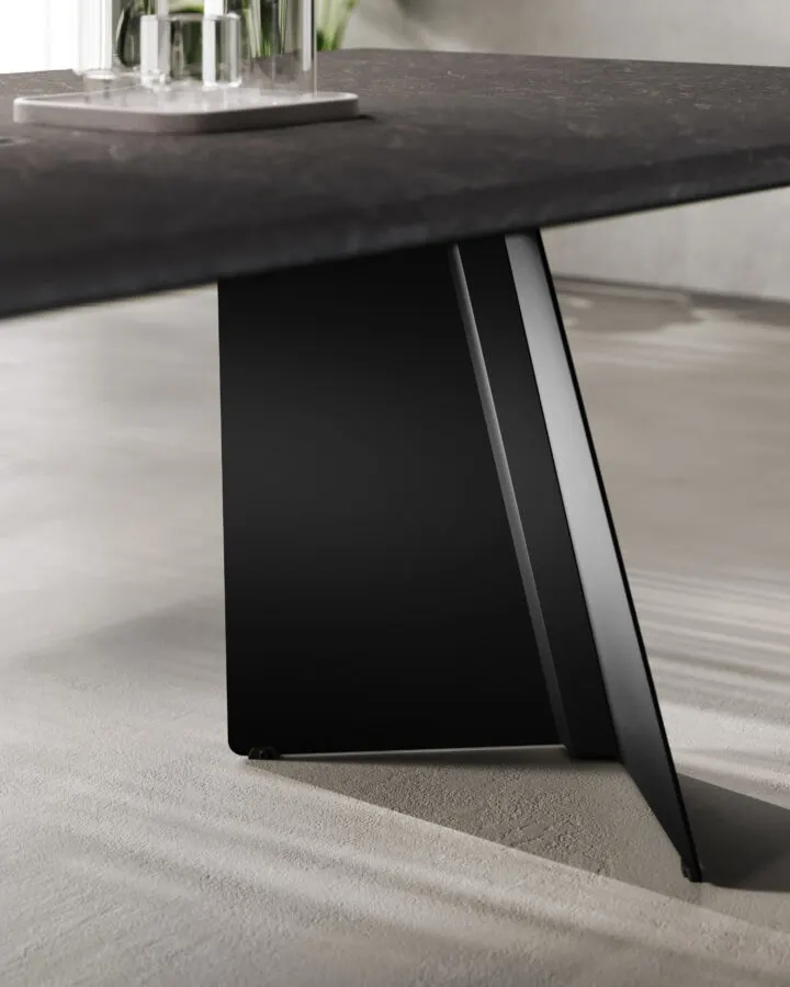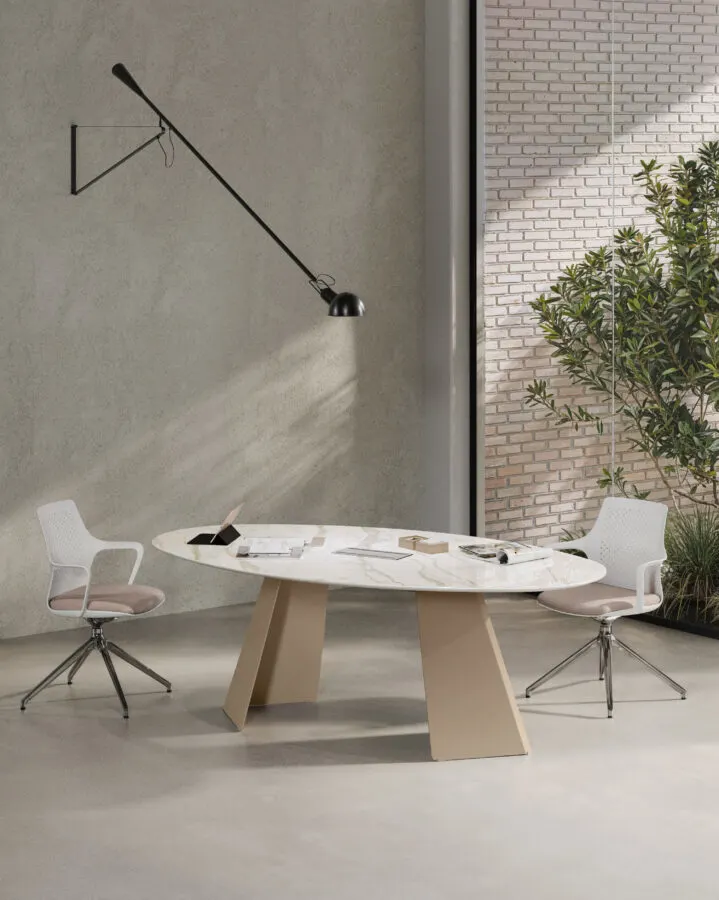 Monolith, sistema direzionale che unisce eleganza e carattere con stile. Il design del basamento in metallo, elemento distintivo e scultoreo, dona un
