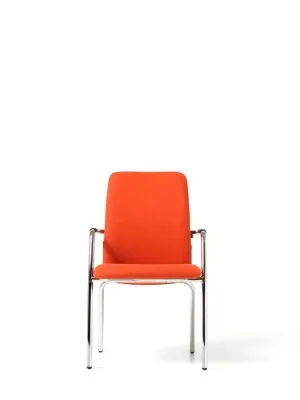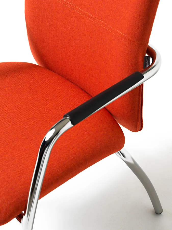 imbottito in poliuretano espanso o in rete, sedile imbottito e rivestito. Telaio slitta cromato o 4 gambe, con braccioli fissi e copribraccioli in polipropilene nero. Impilabile.