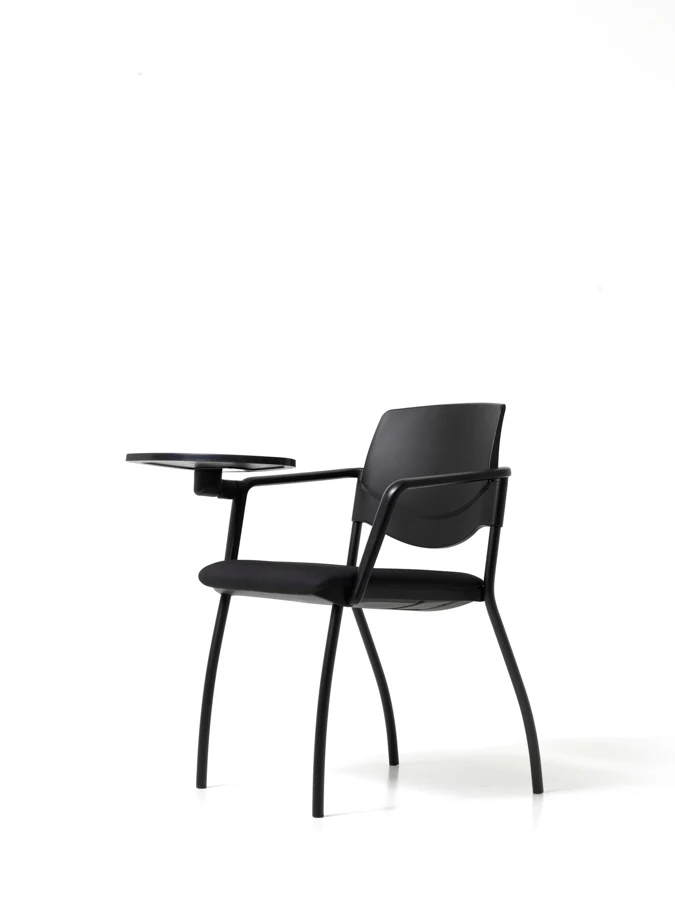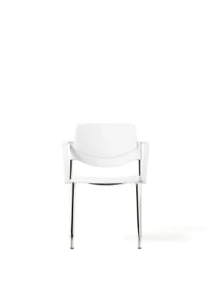 Sedile e schienale in polipropilene bianco o nero, disponibile anche con schienale e sedile rivestiti, o solo sedile. Telaio 4 gambe verniciato nero o cromato. Braccioli neri o bianchi, possibilità di tavoletta scrittoio e agganci fissi. Disponibile anche su panca 2/3/4/5 posti.
