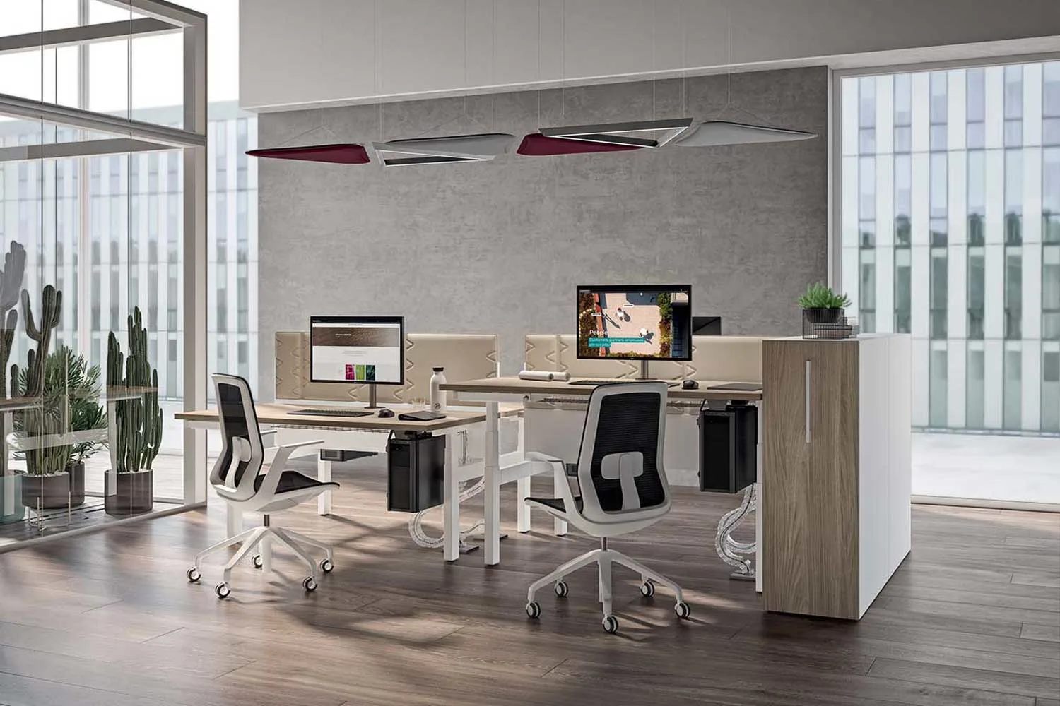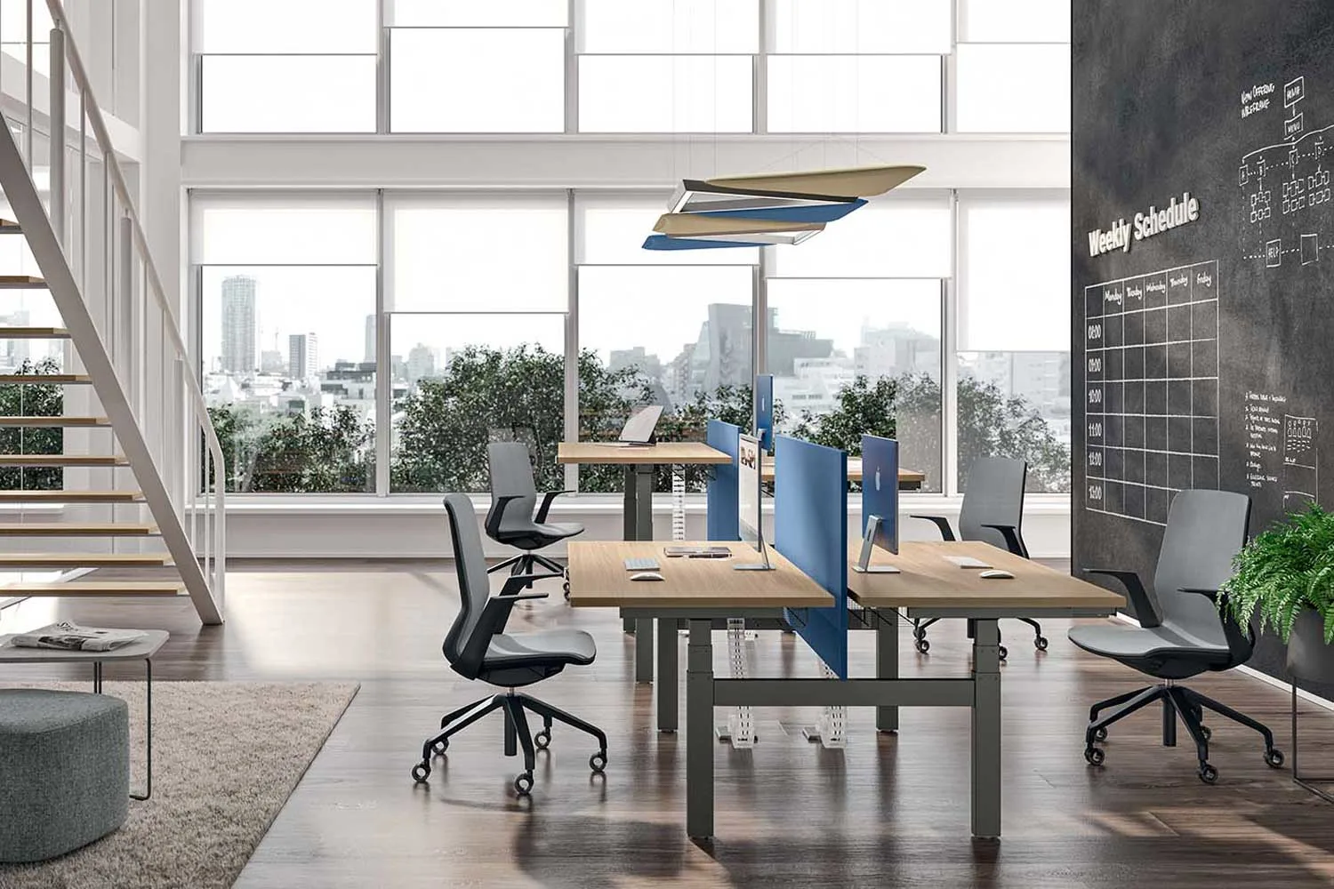 Il modello di scrivania Up&Up è progettato per il benessere lavorativo delle persone: il piano è regolabile in altezza, grazie ad un meccanismo automatico, che offre la possibilità di cambiare posizione nell’arco della giornata e di lavorare anche in piedi, per favorire la circolazione e non sovraccaricare la colonna vertebrale. Il comando con sistema up&down per regolare il tavolo è integrato nel design della scrivania e unisce in modo perfetto estetica e innovazione, permettendo di ottenere, con un piccolo gesto, un benessere posturale superiore. Grazie al comando a memorie è